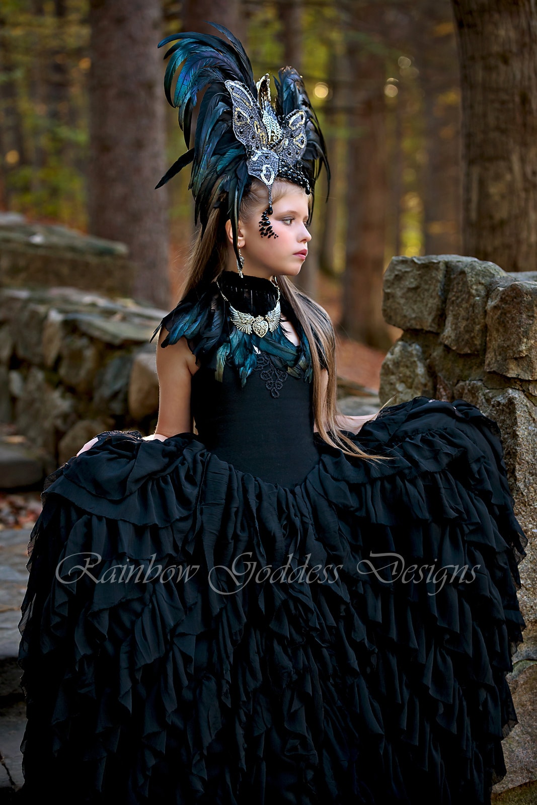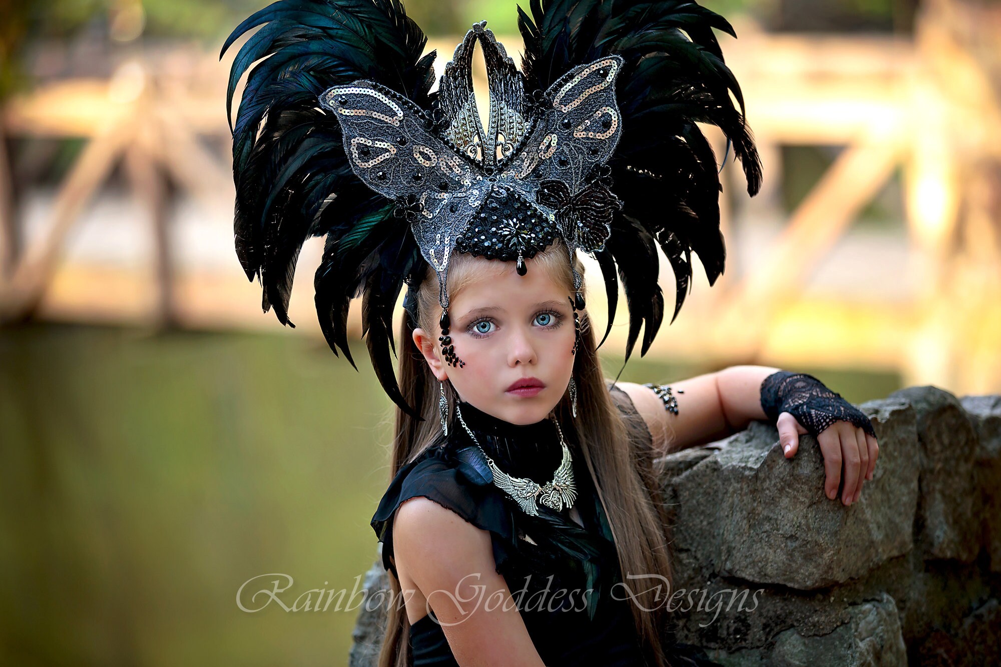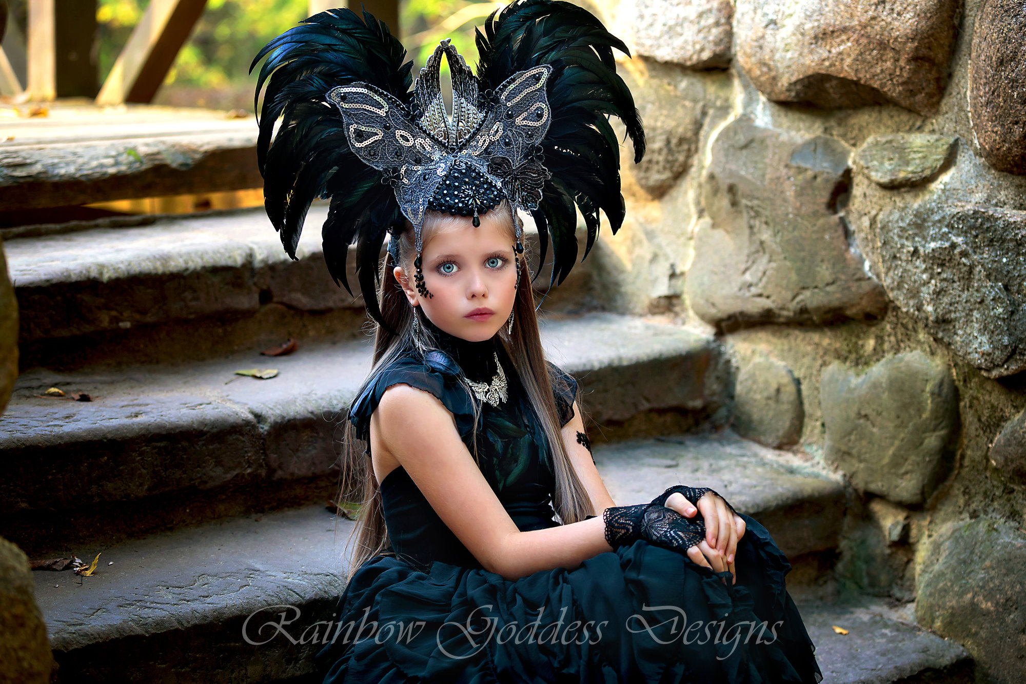 This feather headpiece is made up of large black iridescent (tones of blue & green) rooster feathers, butterfly sequin appliques (on both sides), and plastic angel wings. I added rhinestones throughout it and black crystal droplets to the ends of the butterfly wings and in the center for added sparkle.