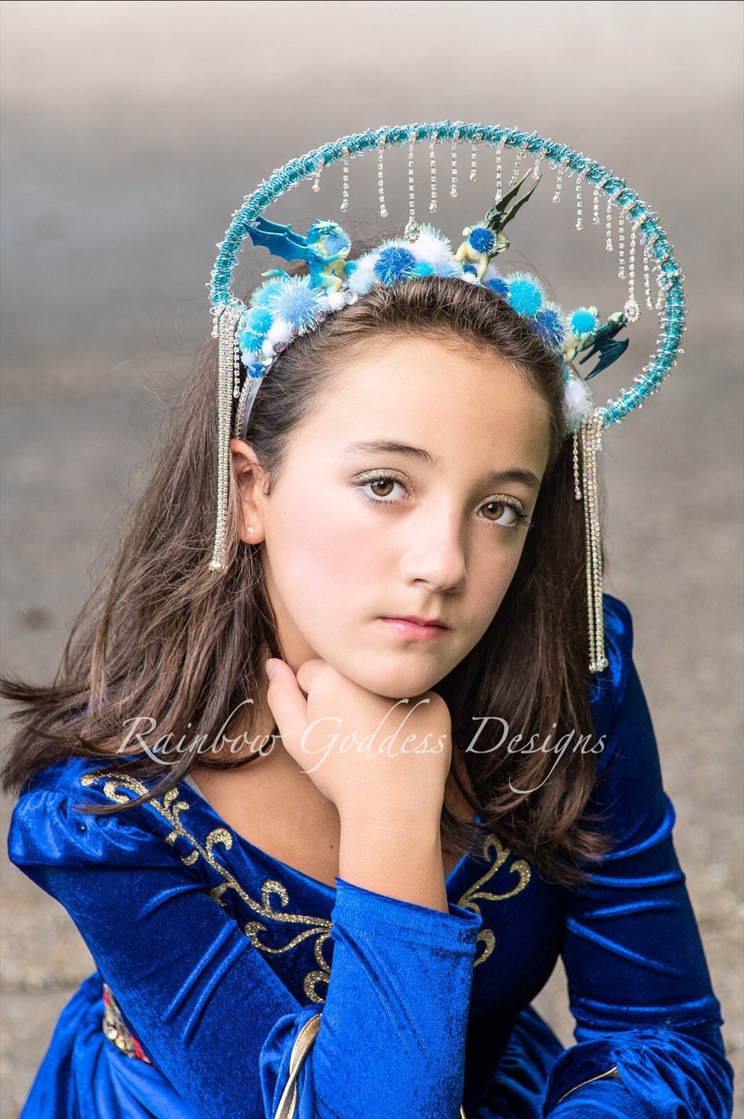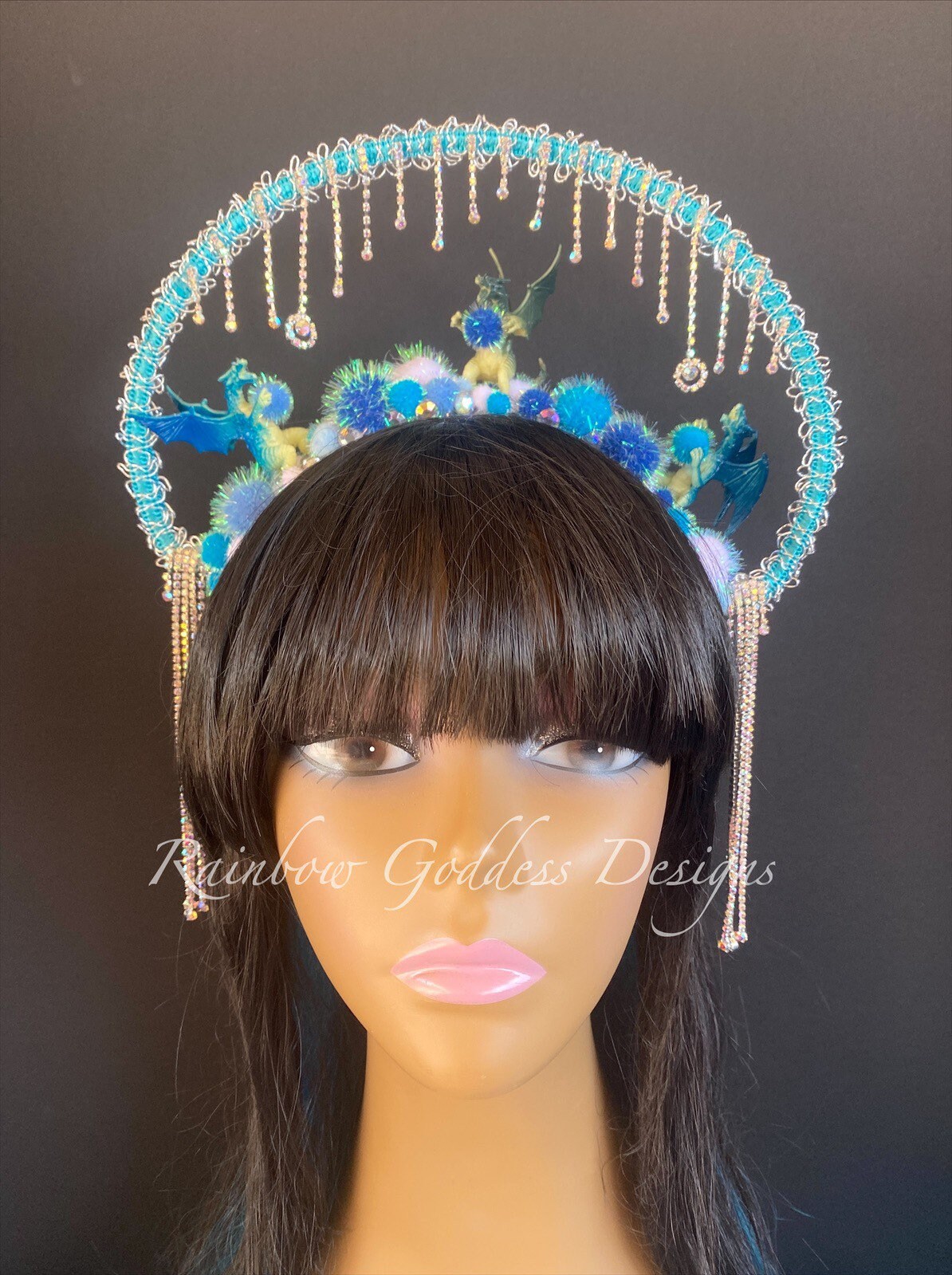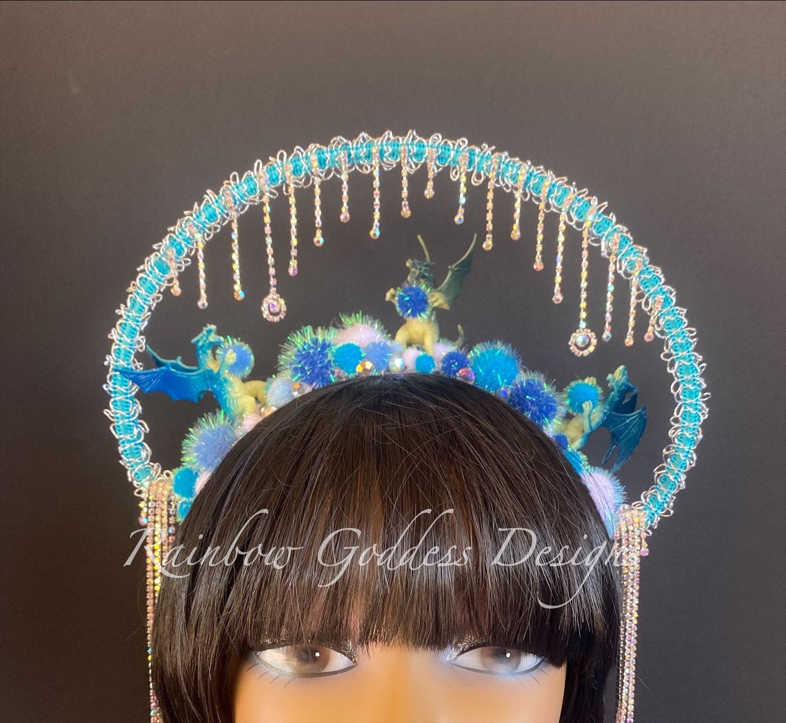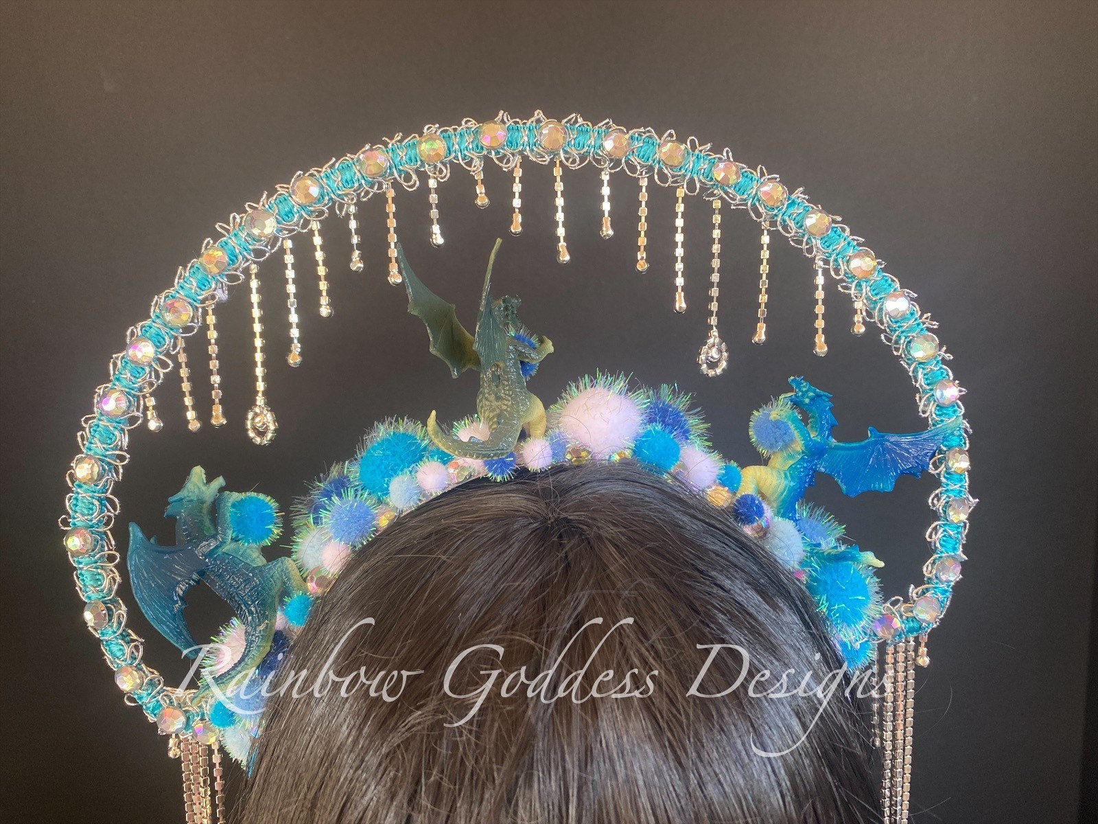 This dragon themed fantasy halo headdress is made up of three small dragons surrounded by sparkle pom poms and AB gems. AB crystal rhinestone chains dangle along the halo and to each side making it look like ice and snow.
