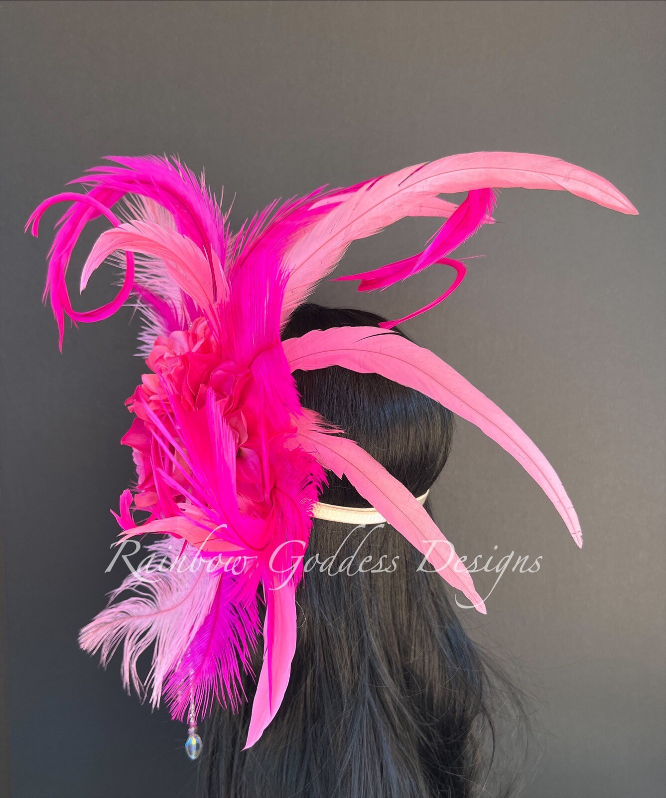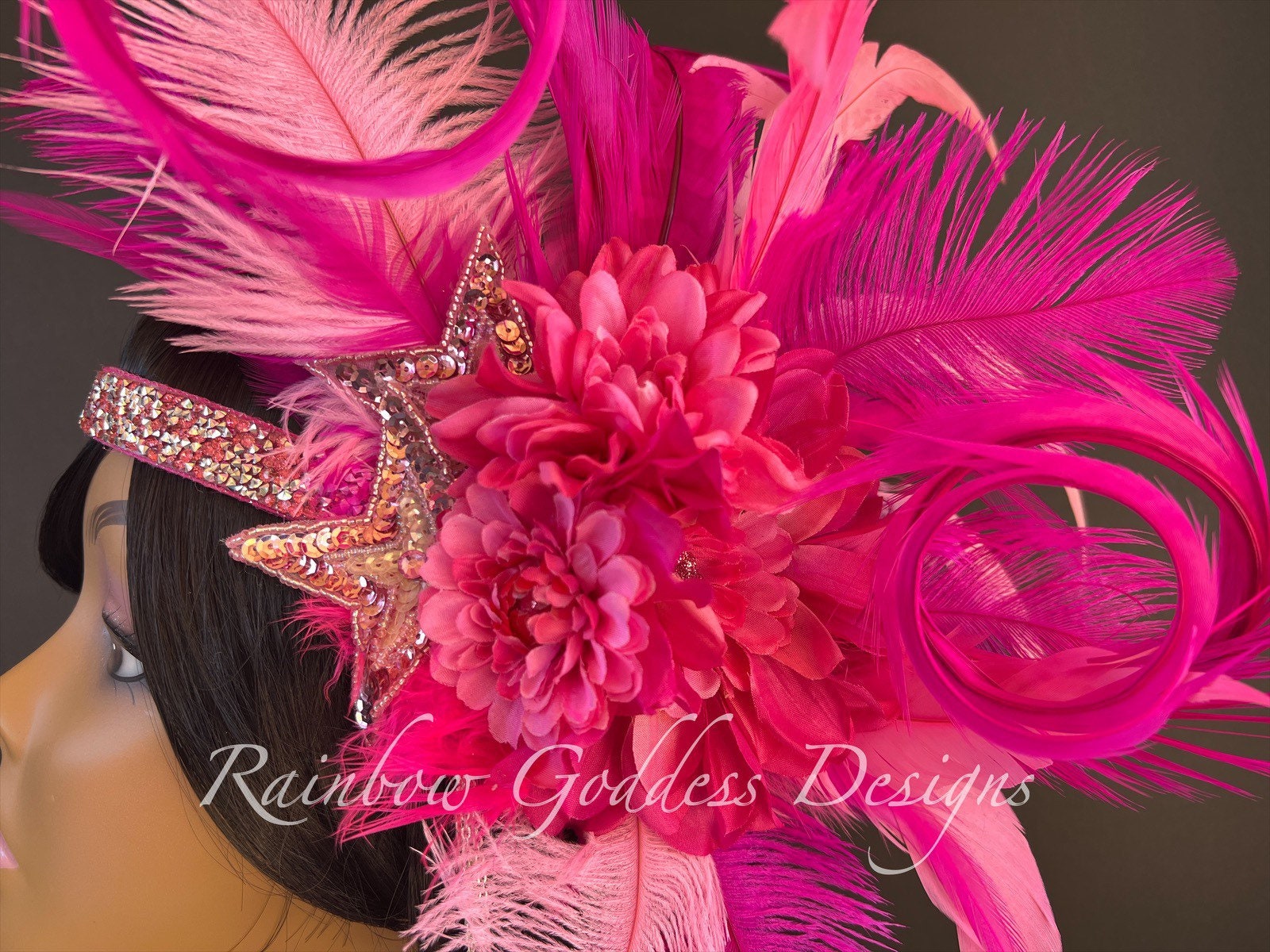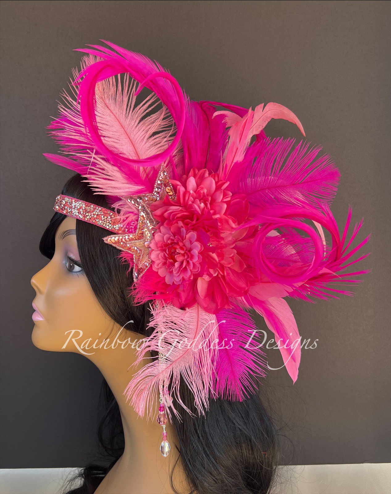This three tone bright pink headband is made up of high quality fabric flowers, feathers (pheasant, ostrich and rooster), sequins star appliqués, and crystal dangles. All attached to a rhinestone band making it super sparkly and oh so magical!