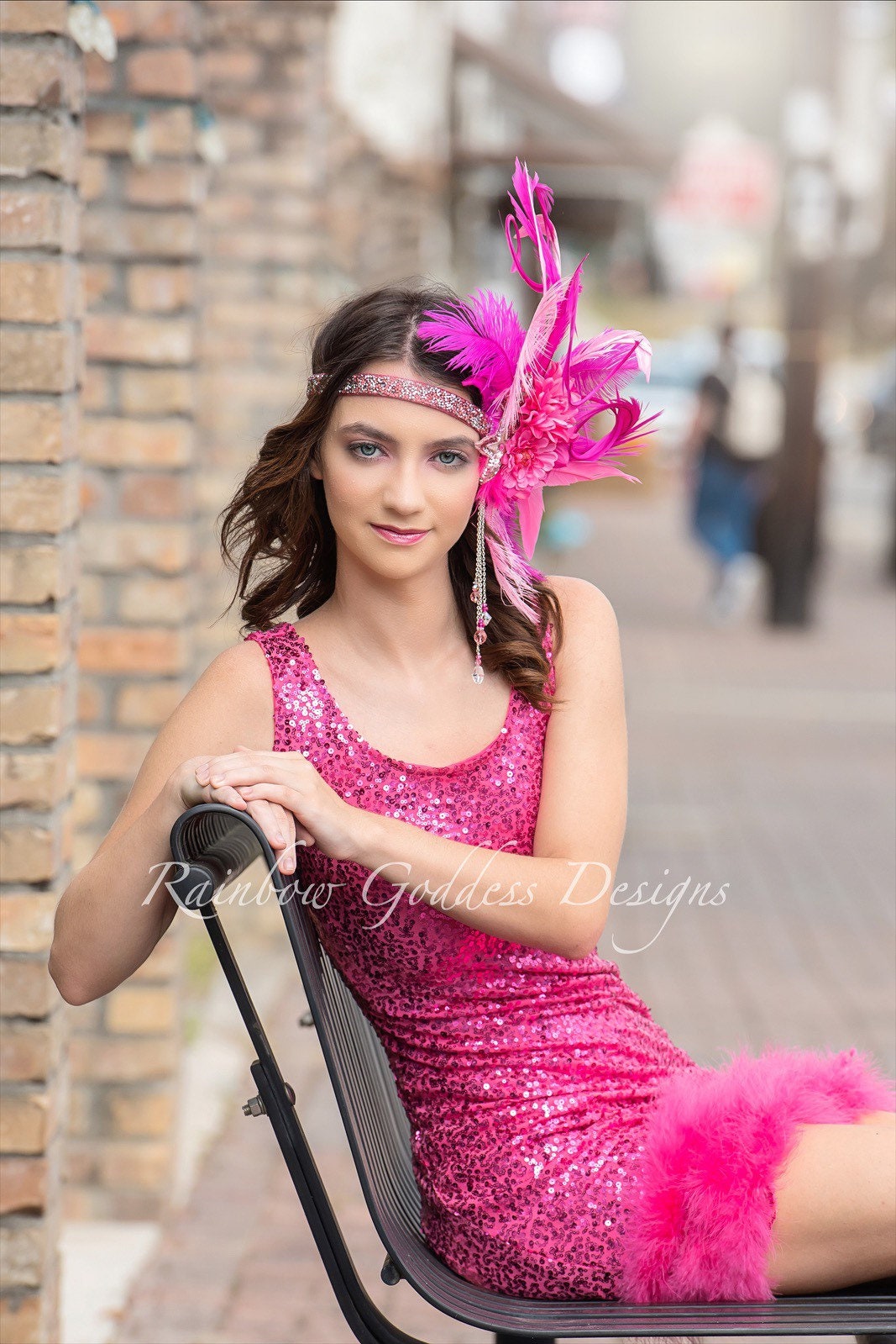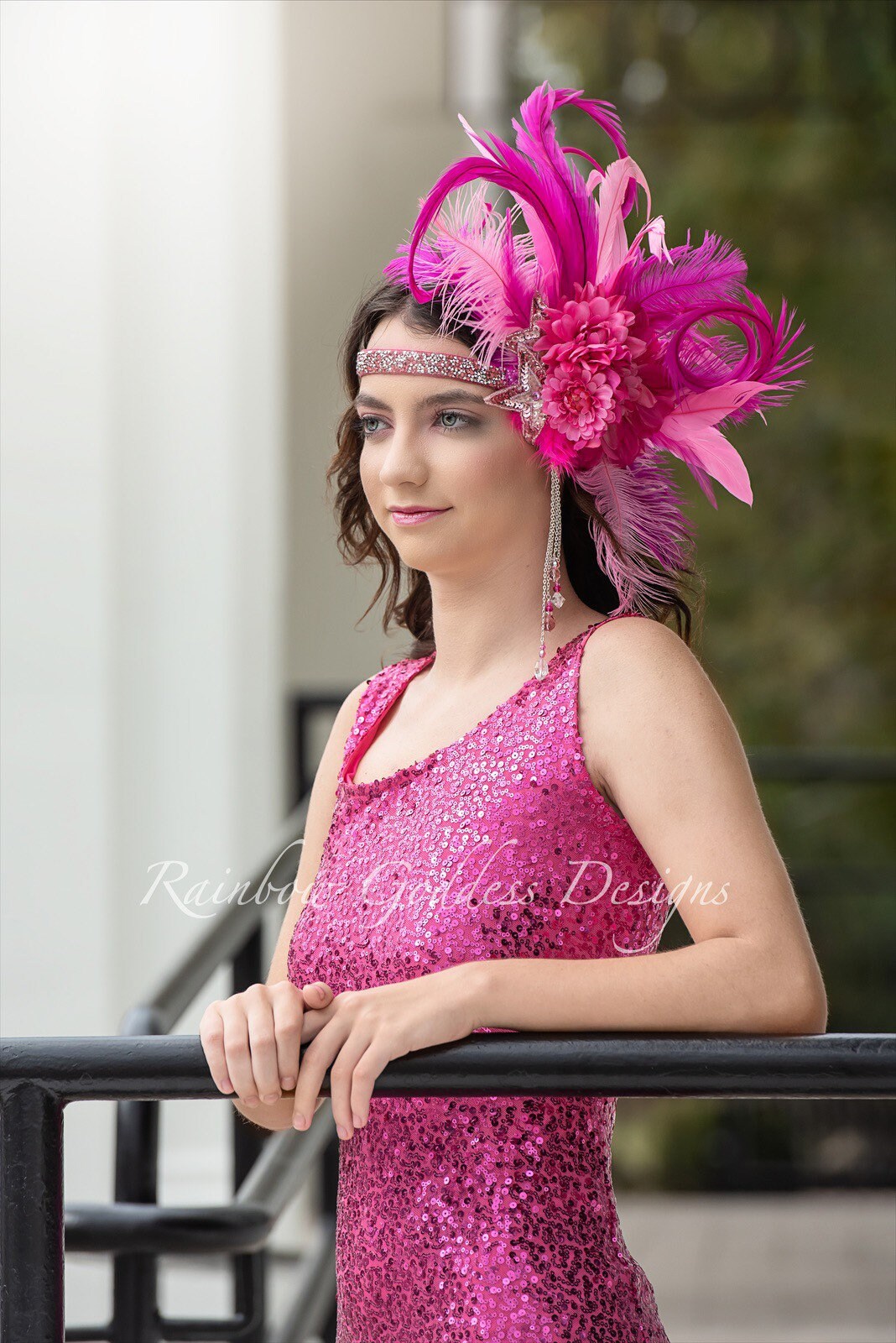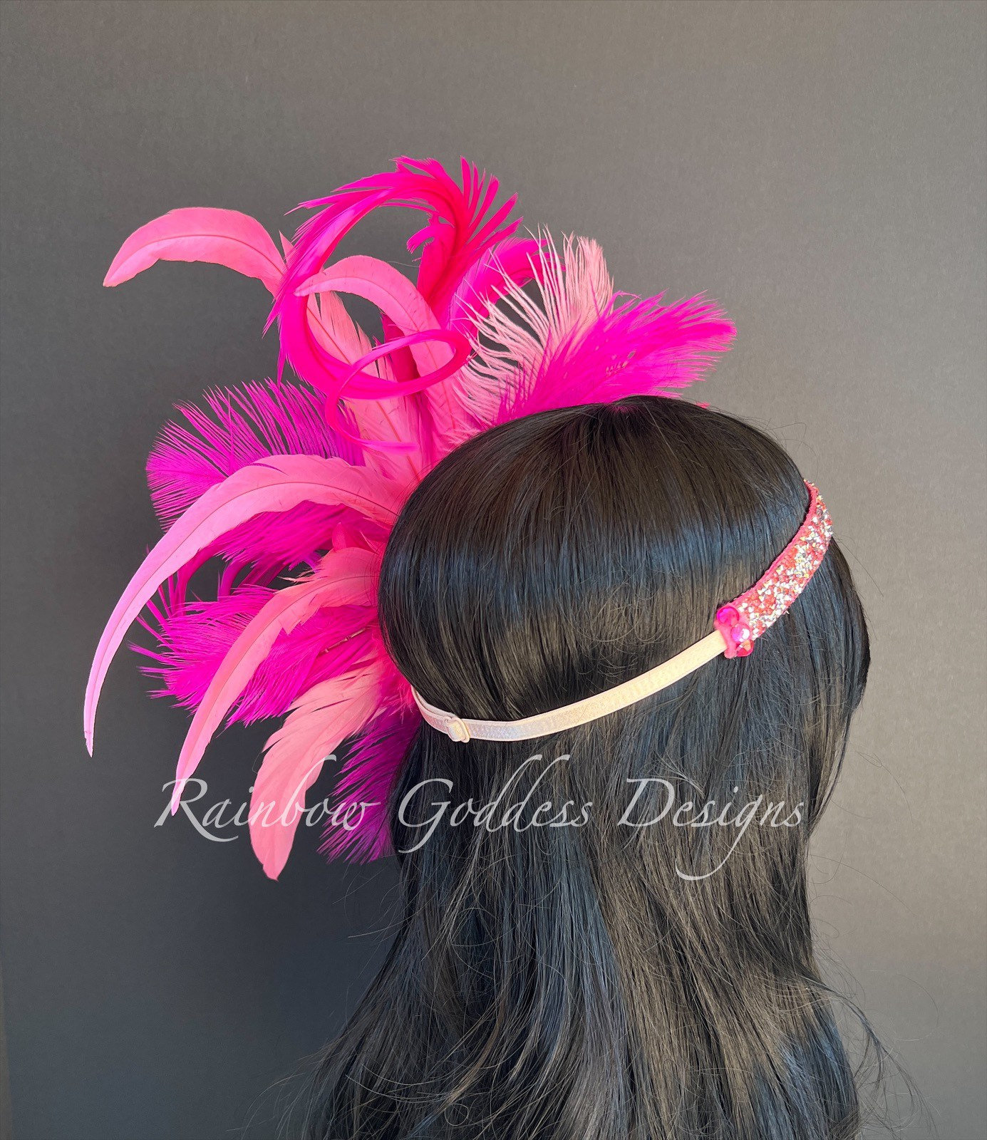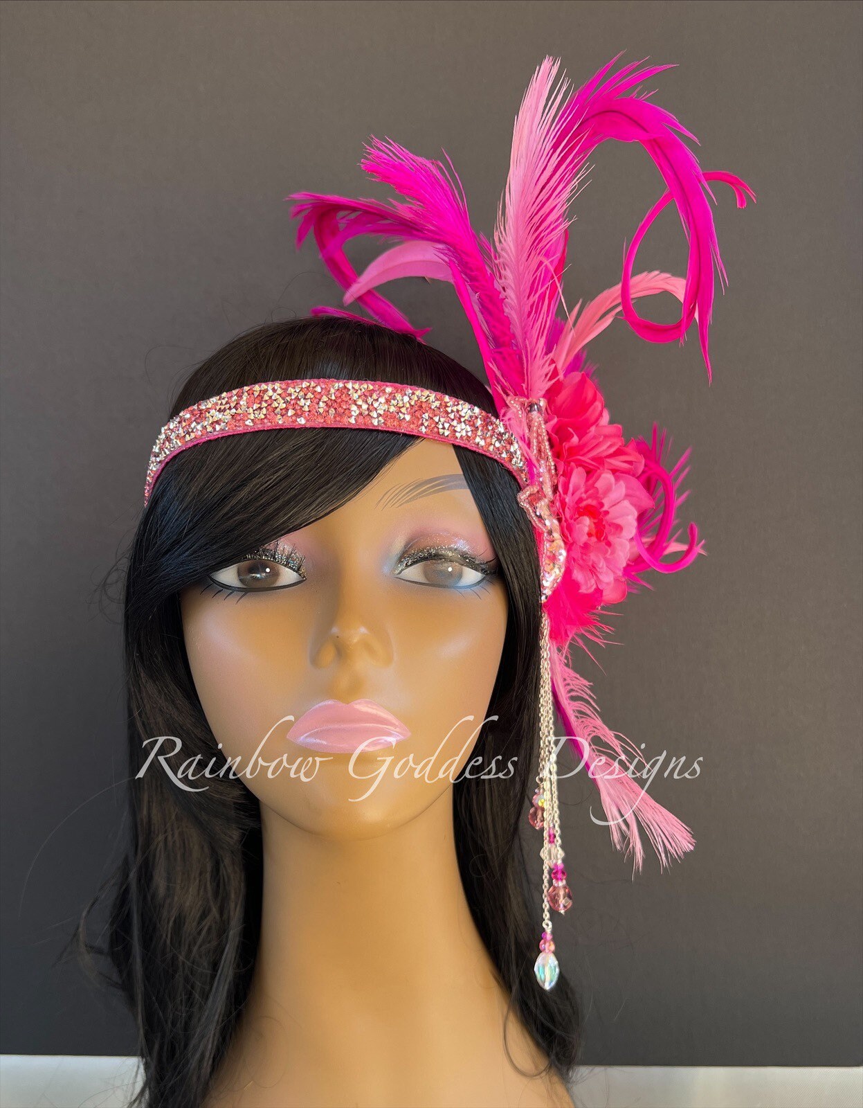 This three tone bright pink headband is made up of high quality fabric flowers, feathers (pheasant, ostrich and rooster), sequins star appliqués, and crystal dangles. All attached to a rhinestone band making it super sparkly and oh so magical!