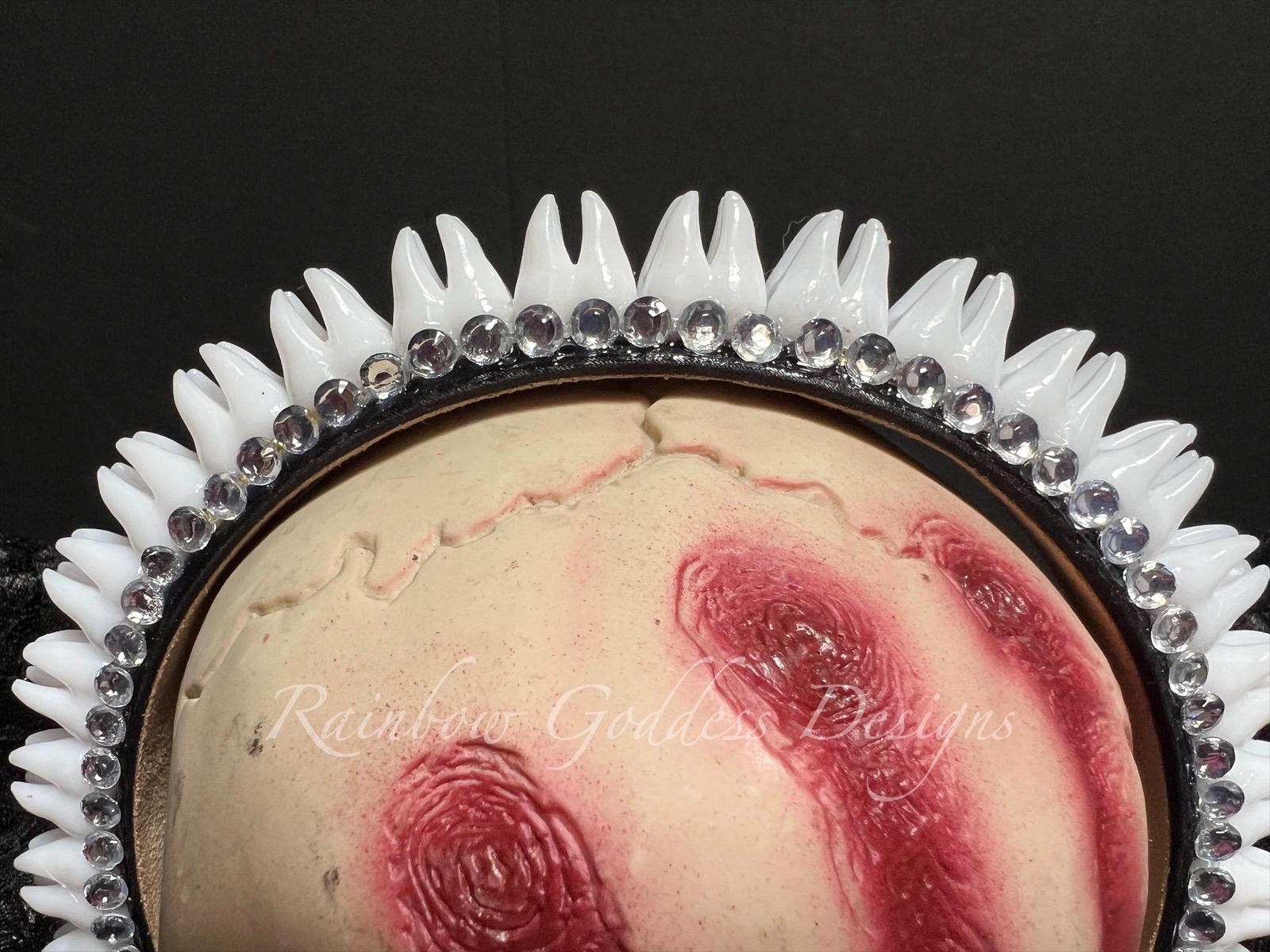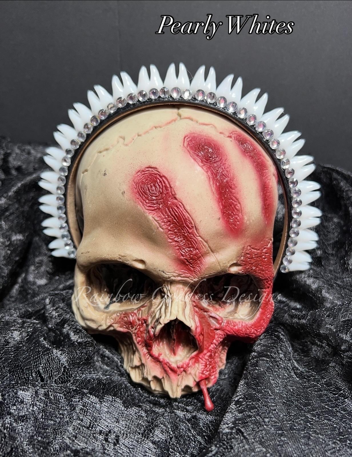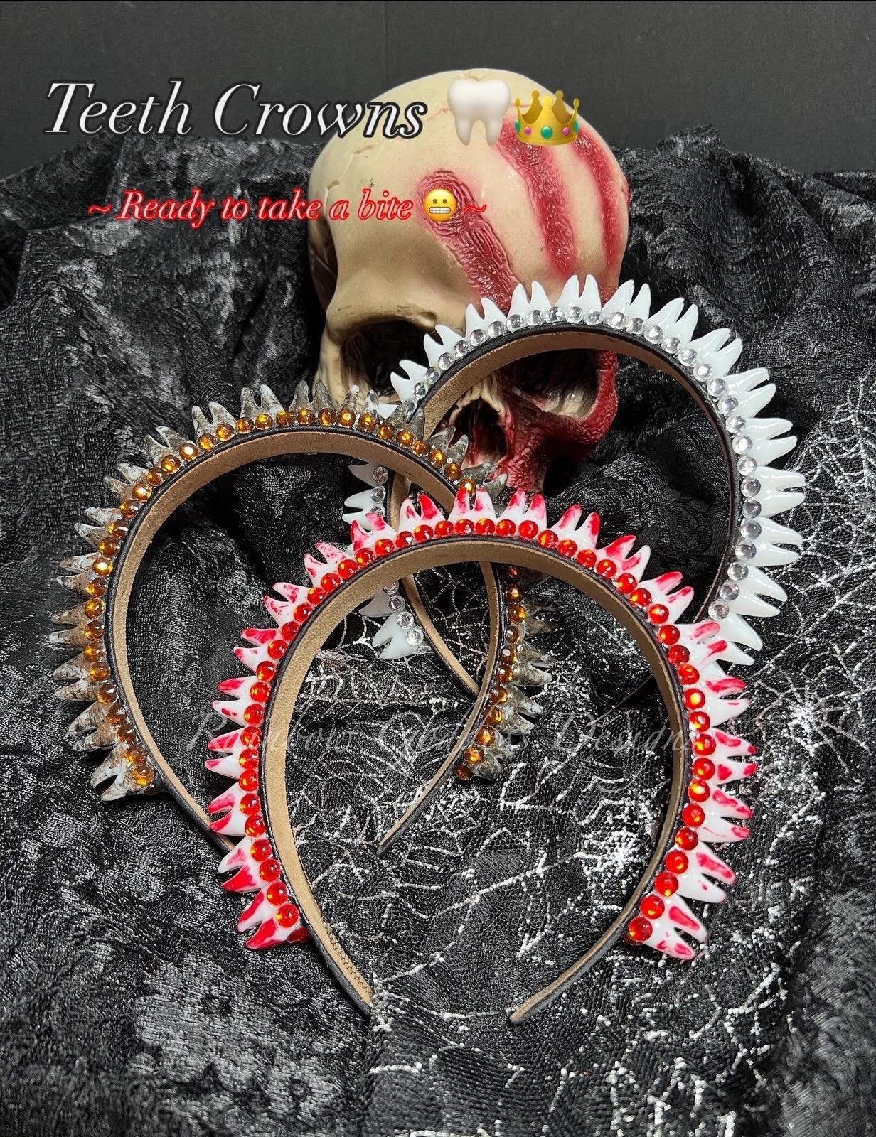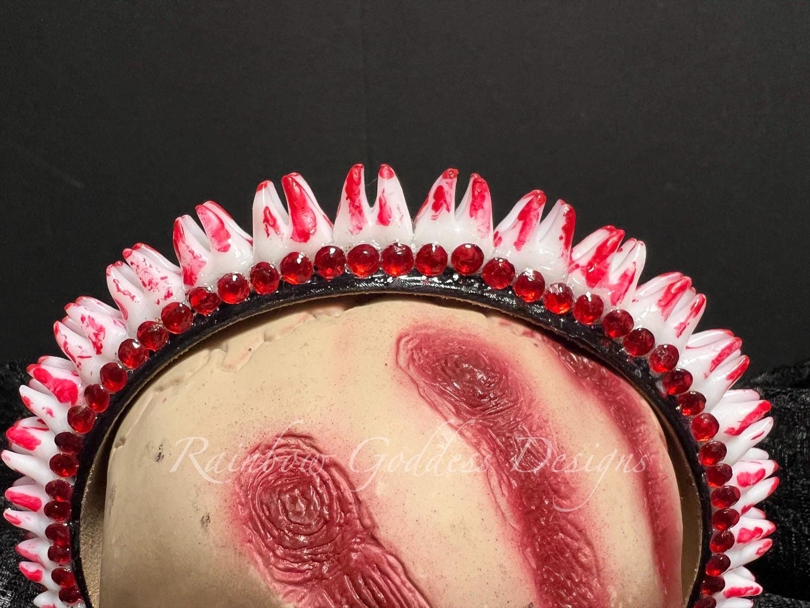 This eerie Teeth Crown Headband is the perfect blend of creepy and campy — handcrafted from plastic molars carefully attached to a sturdy headband and accented with sparkling acrylic rhinestones for a ghoulishly glamorous finish.