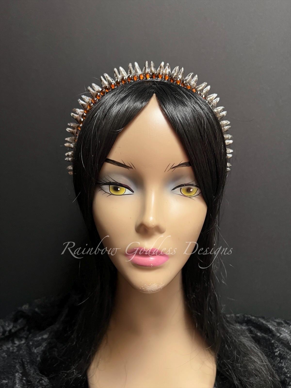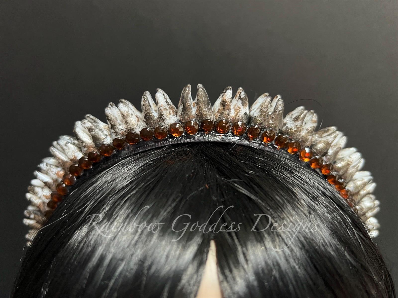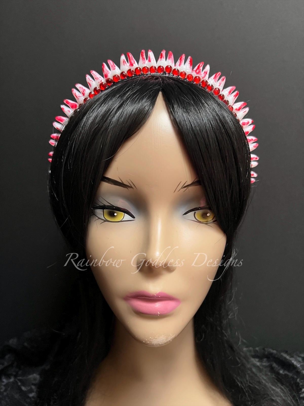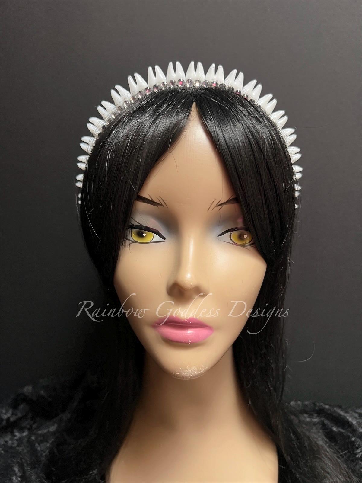 This eerie Teeth Crown Headband is the perfect blend of creepy and campy — handcrafted from plastic molars carefully attached to a sturdy headband and accented with sparkling acrylic rhinestones for a ghoulishly glamorous finish.