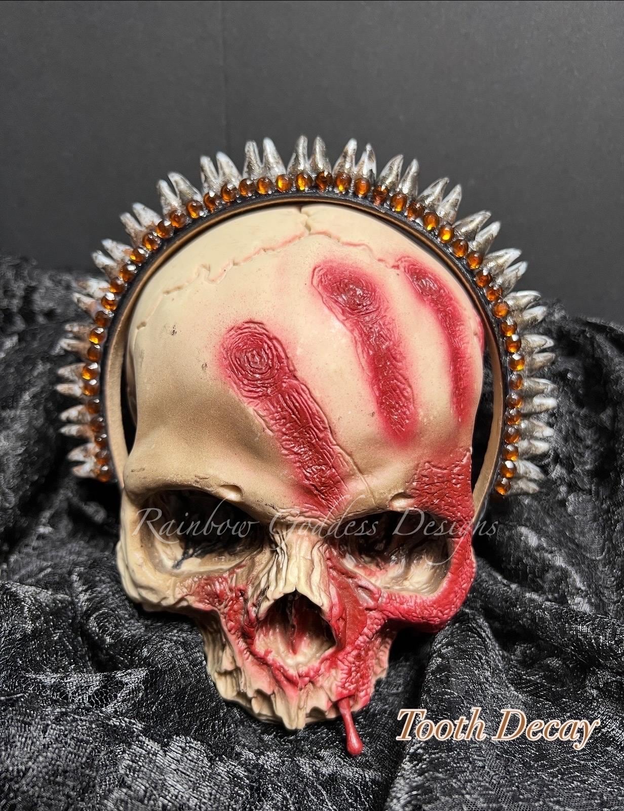 ☠️ Tooth Decay – aged with brown and black paint for that rotten grin vibe.