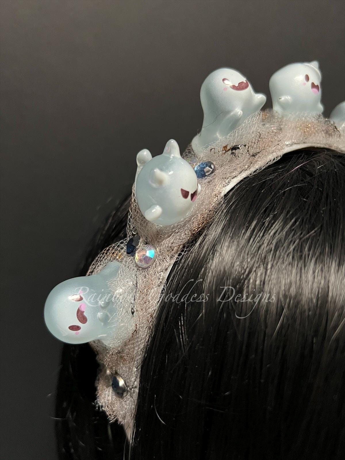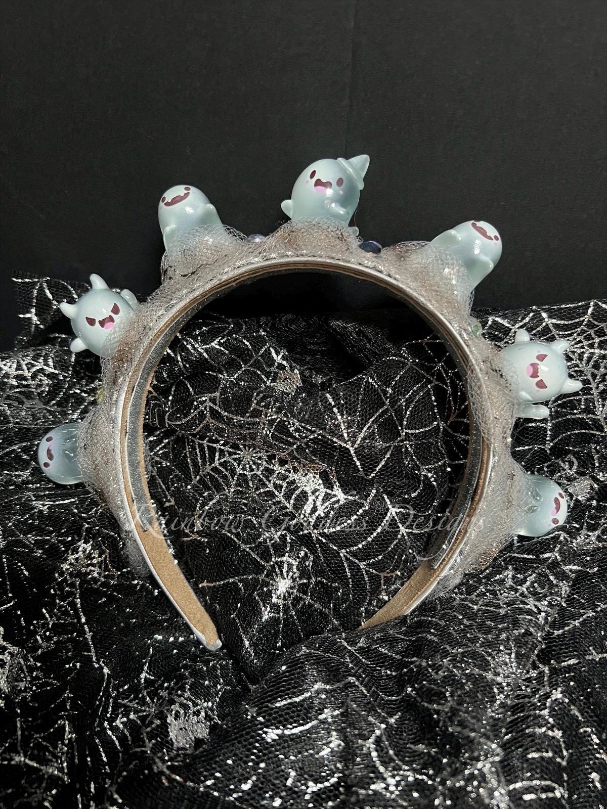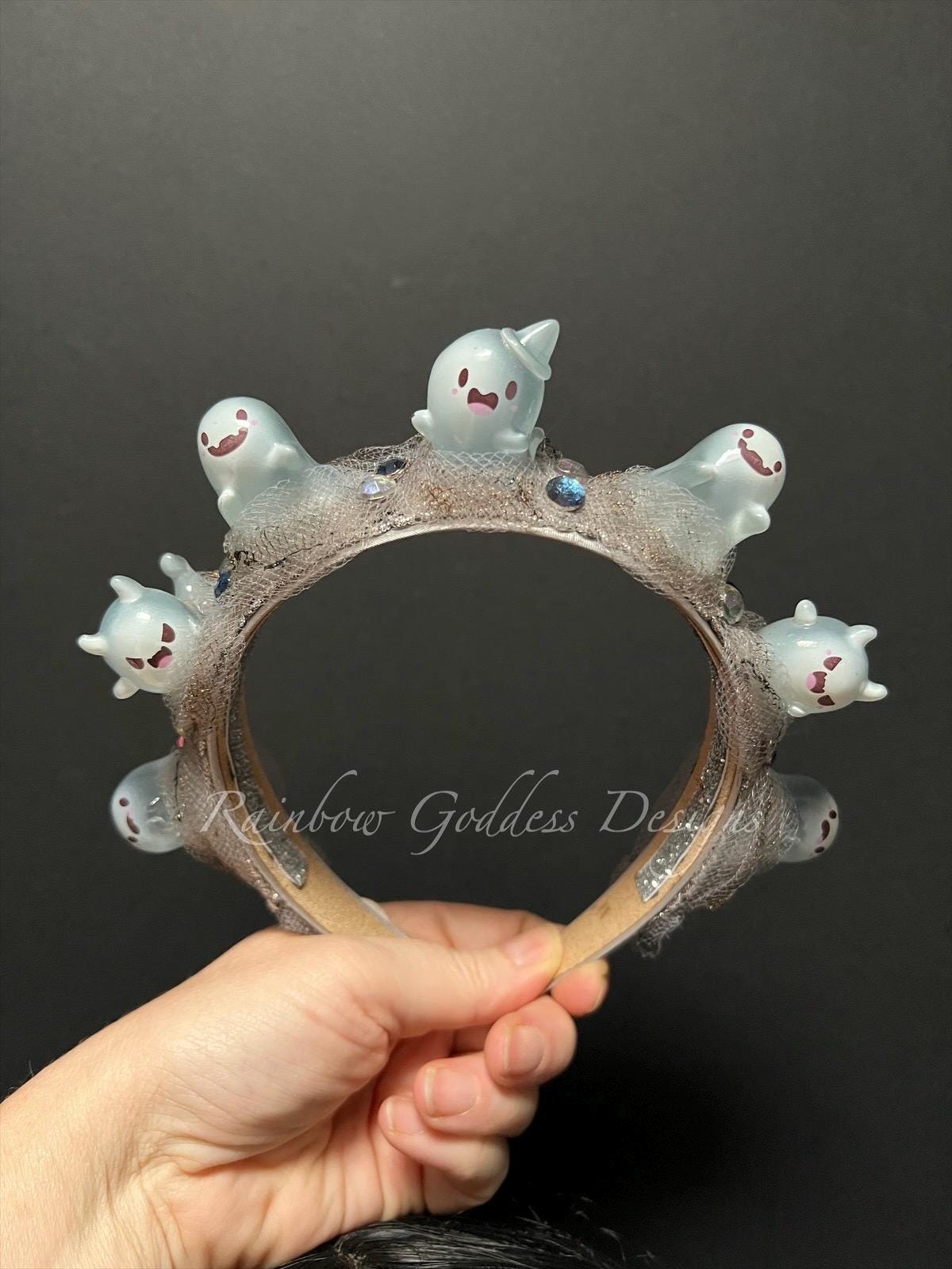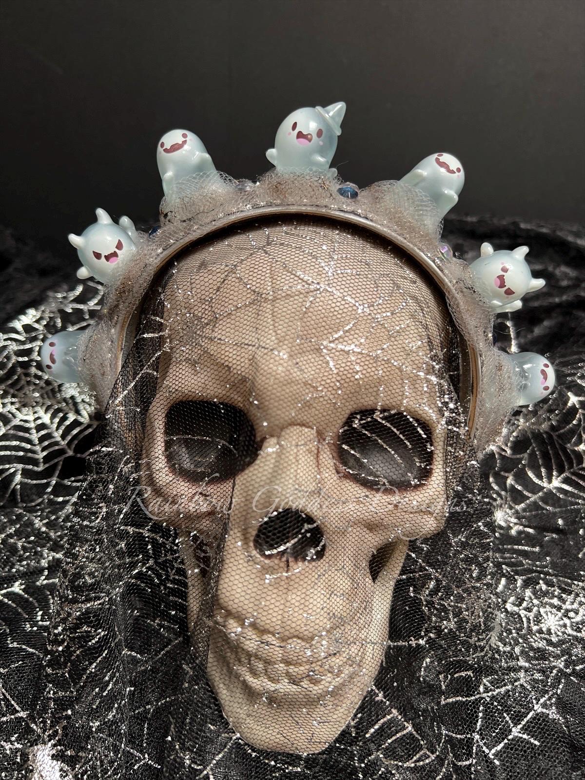 This ghost crown features glow-in-the-dark resin ghost figures perched atop a comfortable headband, surrounded by soft gray tulle brushed with hints of black, brown, and gold paint. The painted tulle creates the illusion of ghosts floating through eerie mist and smoke, while sparkling acrylic rhinestones catch the light for a touch of ghostly glamour. 💀🌙