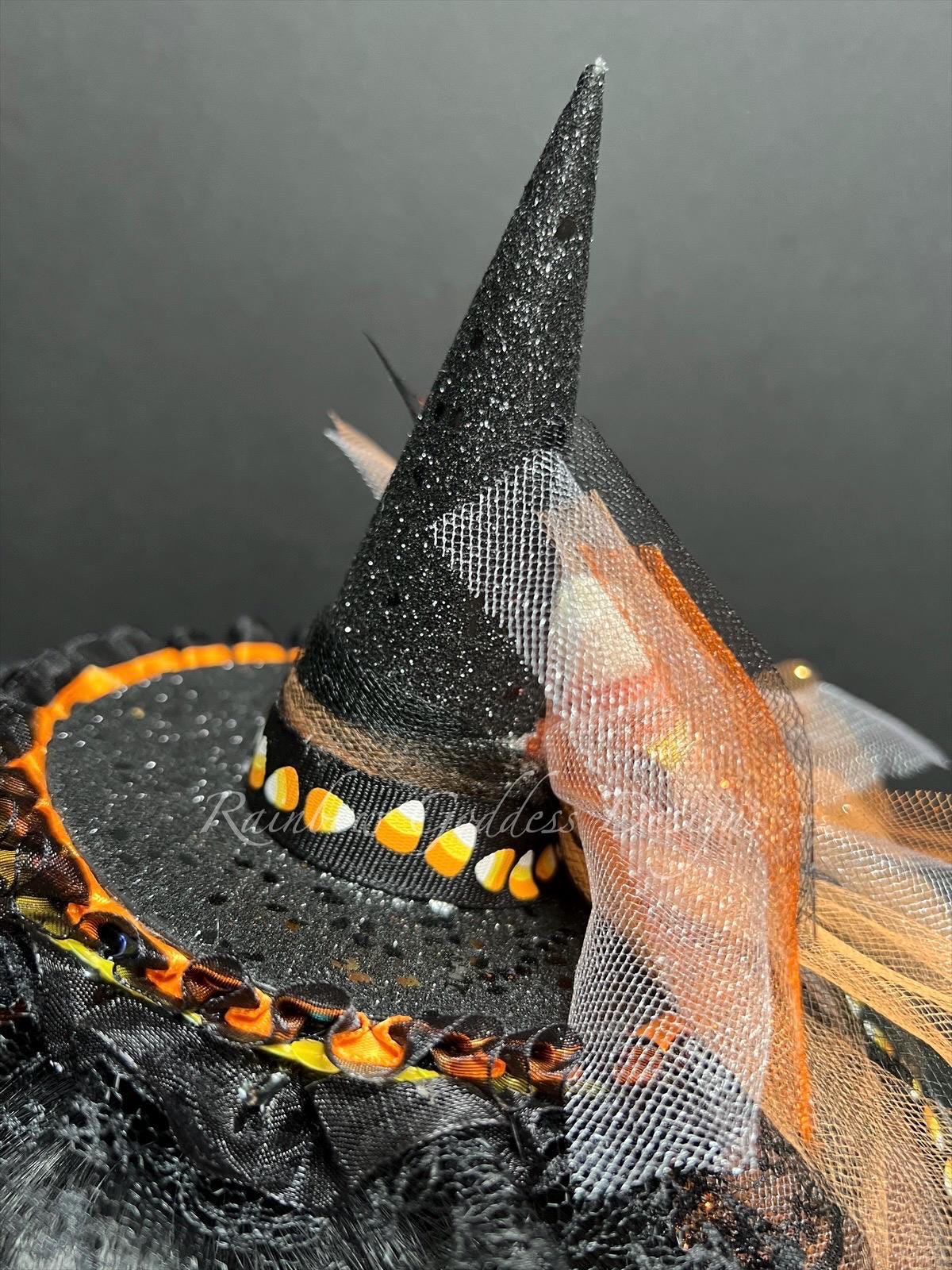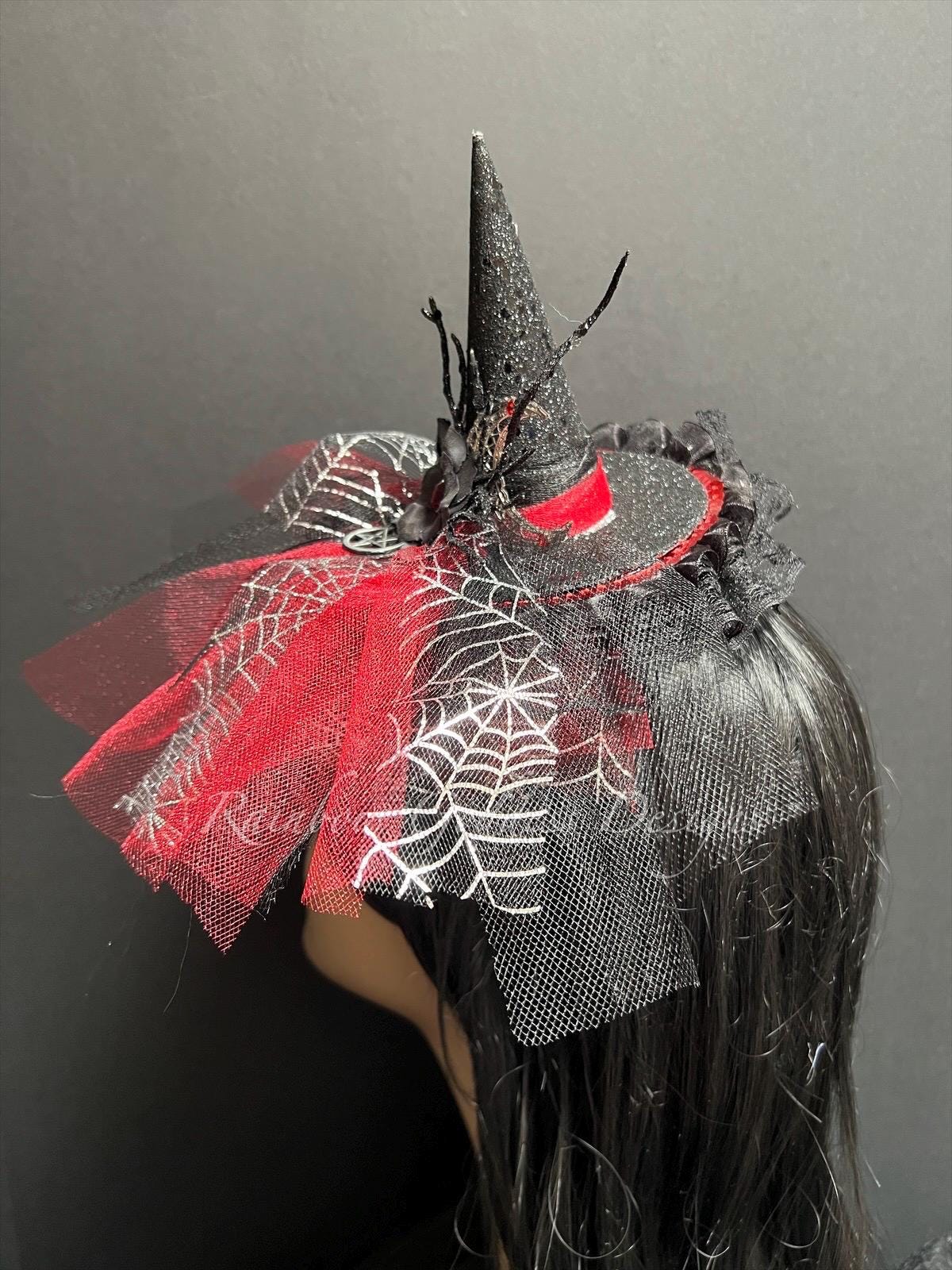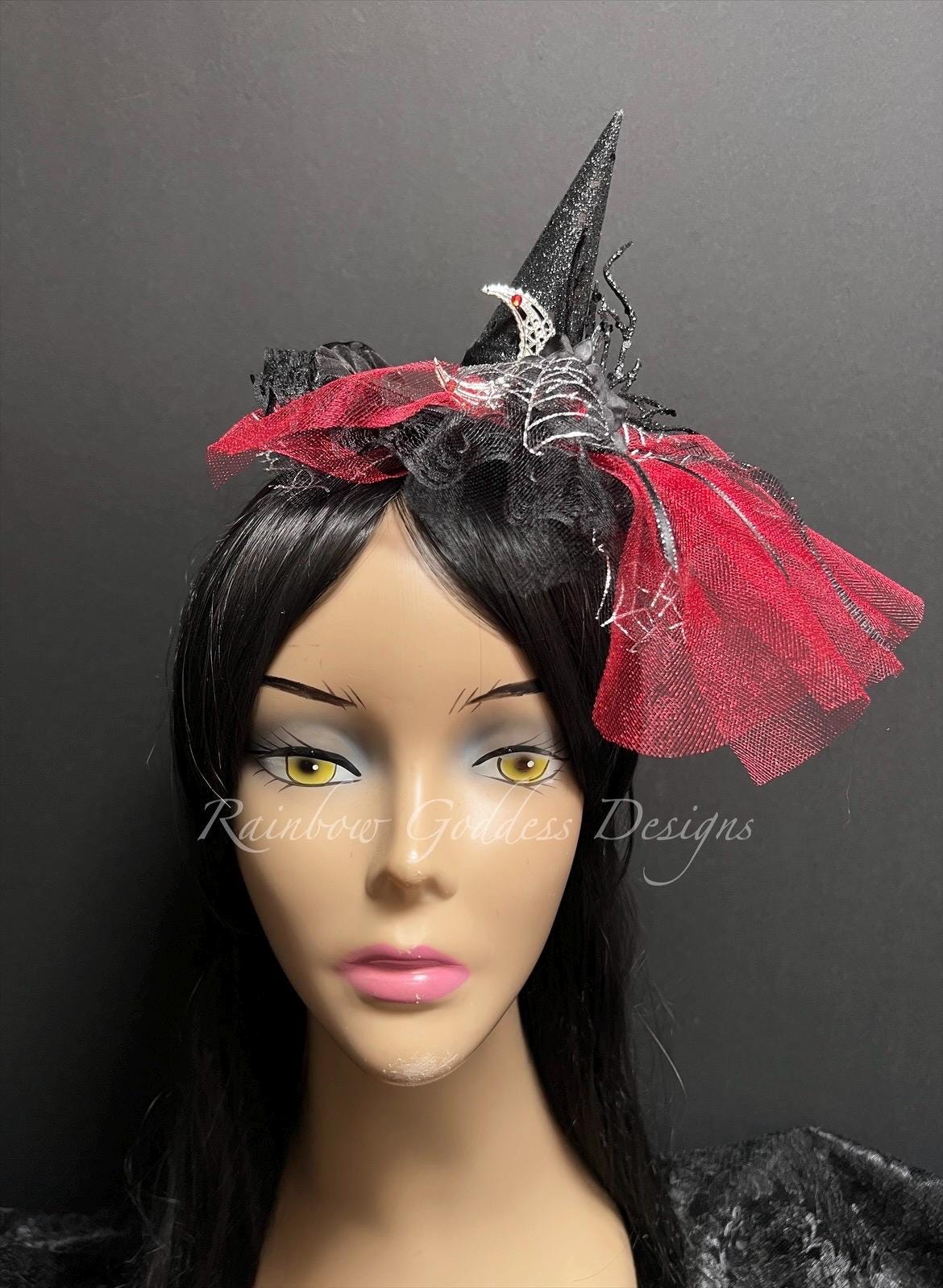 Each mini hat sits atop a black glitter base attached to a black satin headband, trimmed with tulle, lace and ribbons for a dramatic flair. Every hat also features small loops underneath so you can add pins for extra security — perfect for dancing, photos, or spooky adventures!