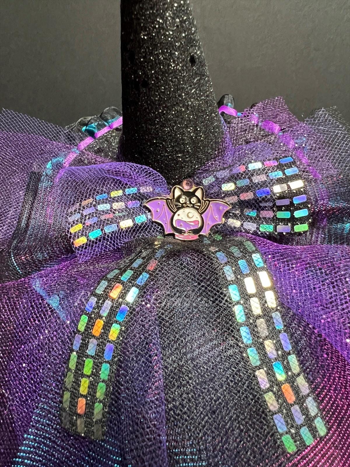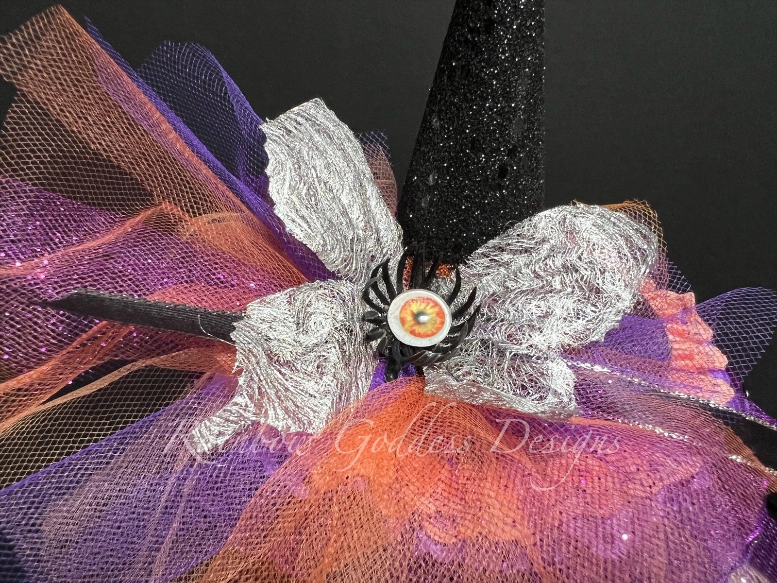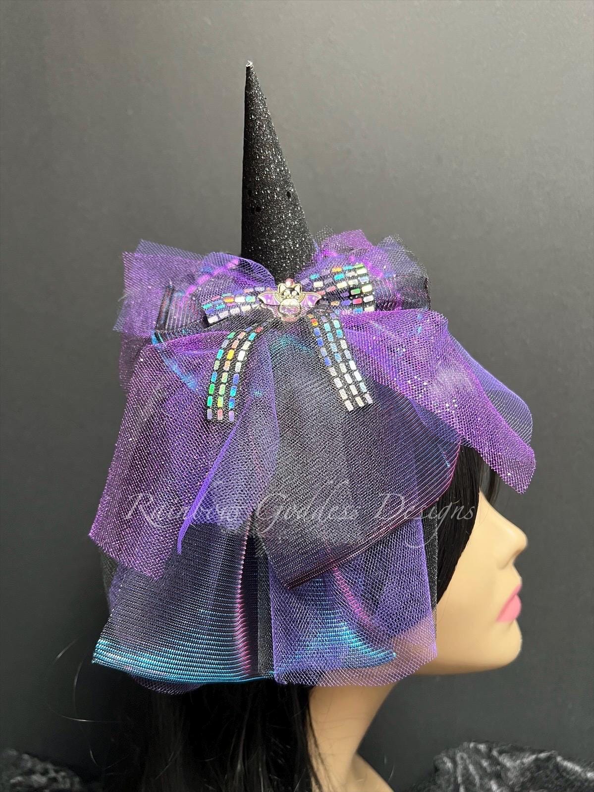Each mini hat sits atop a black glitter base attached to a black satin headband, trimmed with tulle, lace and ribbons for a dramatic flair. Every hat also features small loops underneath so you can add pins for extra security — perfect for dancing, photos, or spooky adventures!