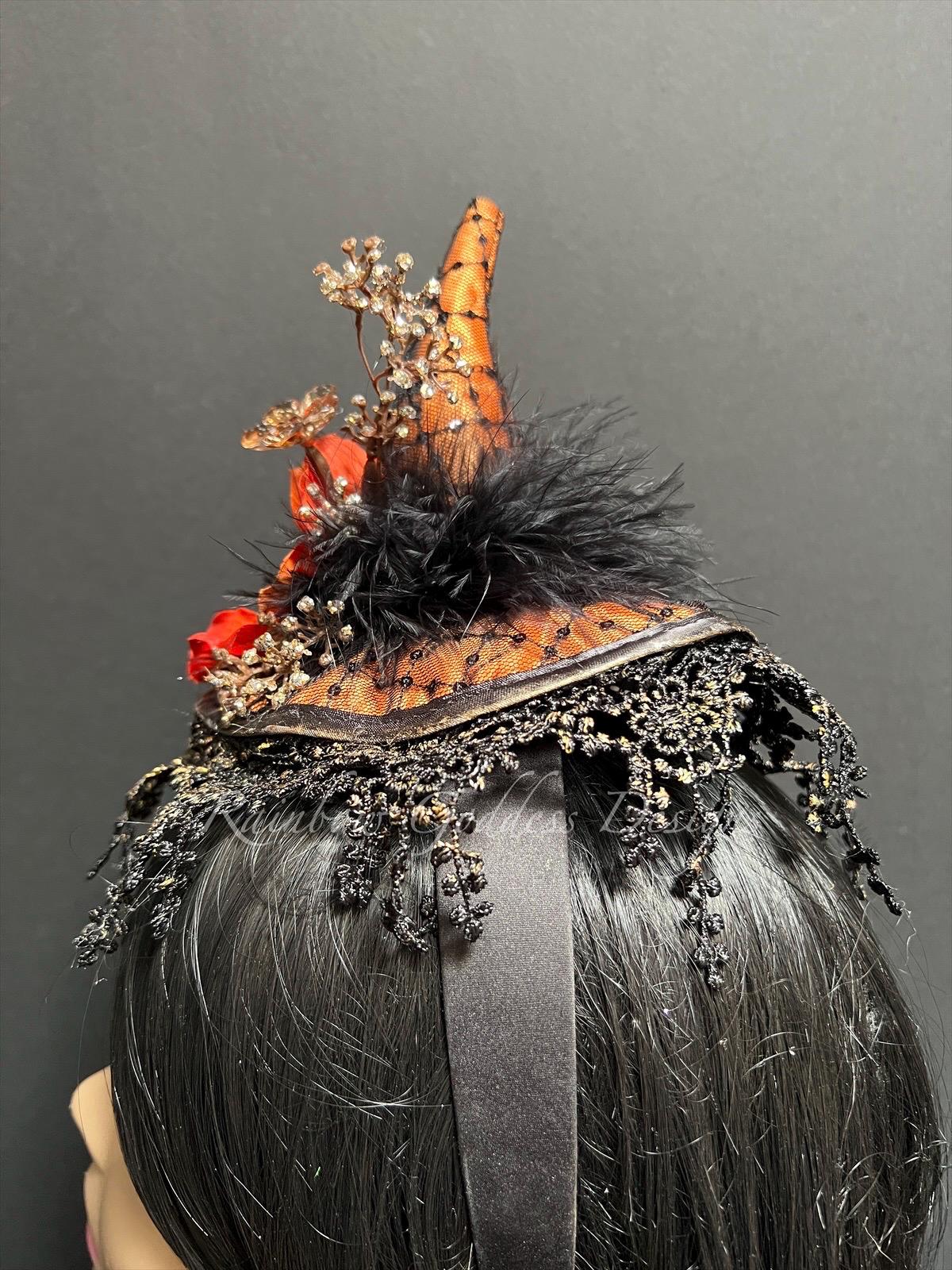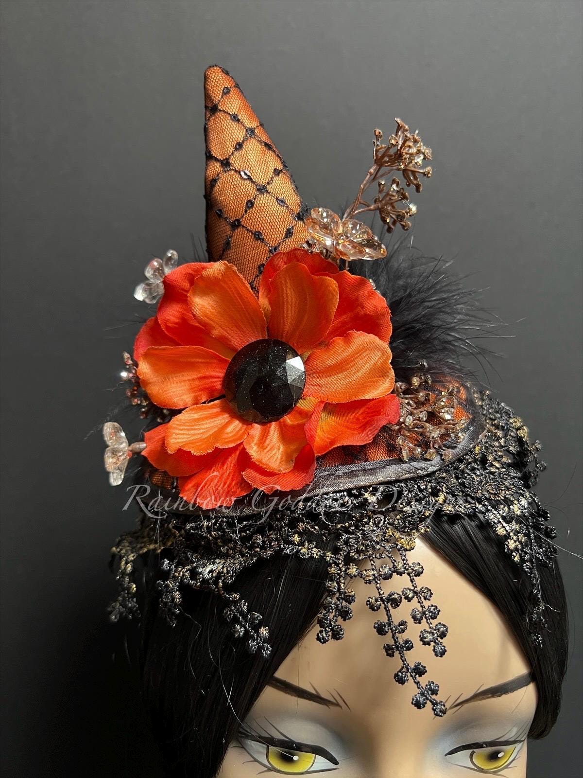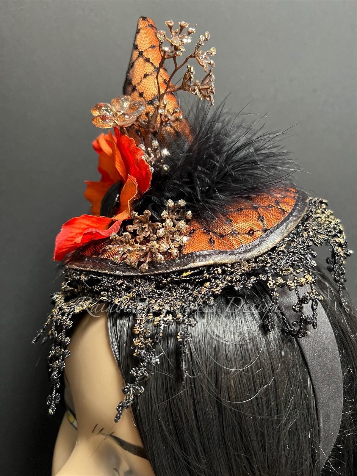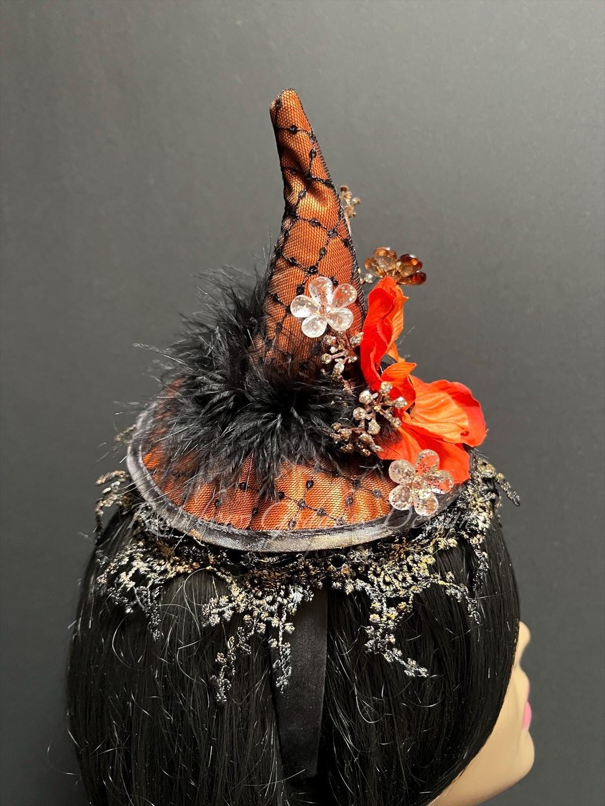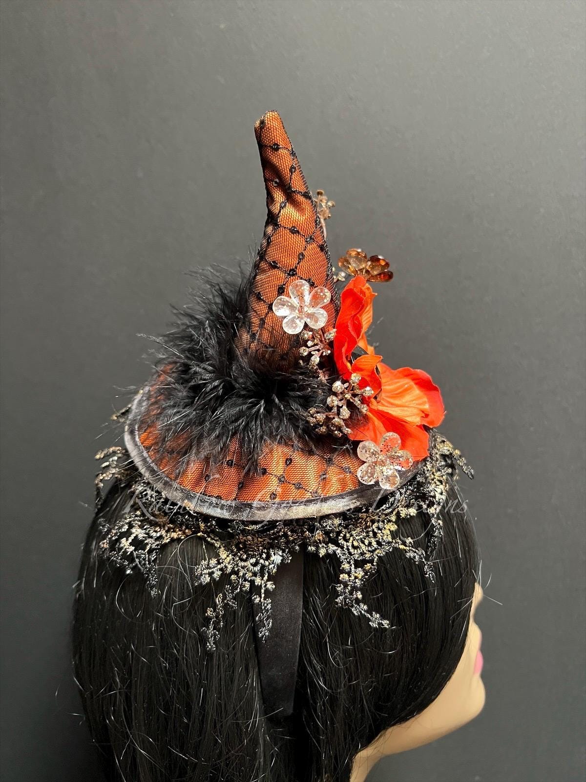 This handcrafted mini witch hat sits atop a black satin headband with loops underneath for pinning securely in place. The hat base shimmers with orange and black sequin fabric, trimmed in soft black feather boa and glittery fall foliage. A striking orange flower with a large black rhinestone center creates the perfect focal point.