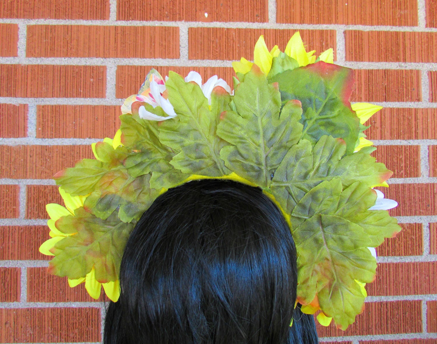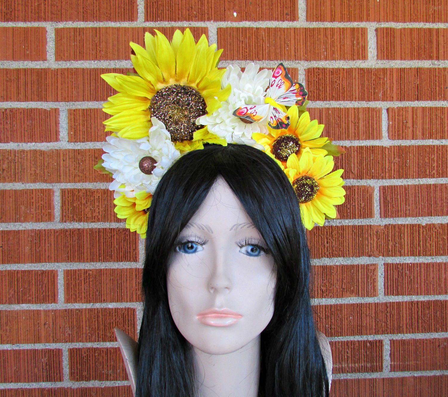 This super adorable floral crown is made up of sunflower and daisy fabric flowers, a feathered butterfly, and green fabric leaves. It has an elastic band in the back that rest behind the head to provide extra security for you active festival/party goers. Perfect accessory for holidays, weddings, special occasions, burning man, festivals, photo shoots, and more.