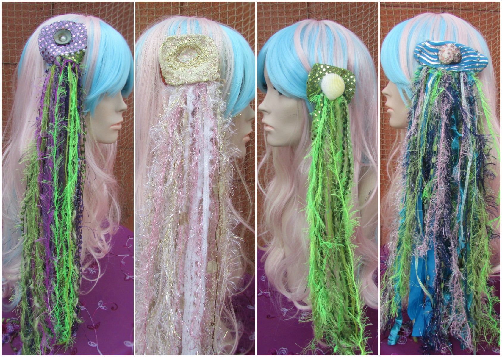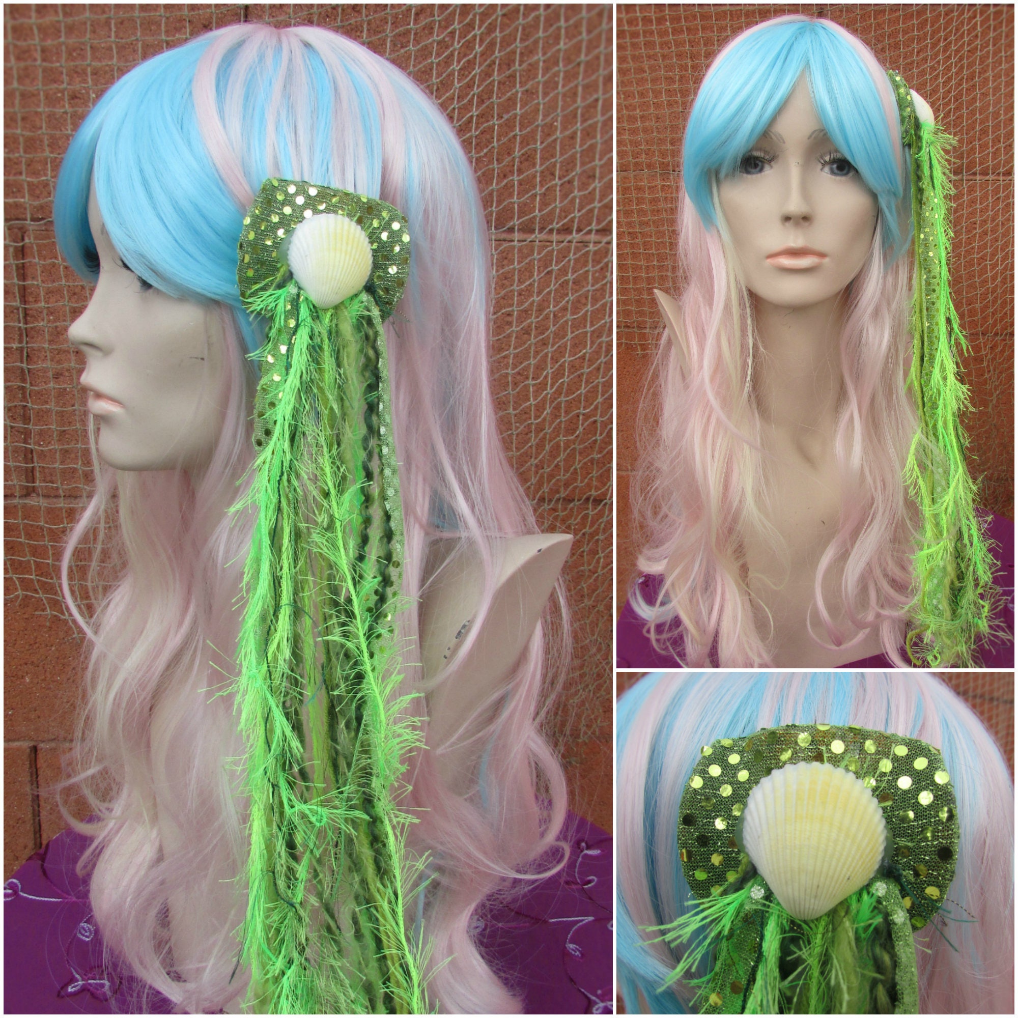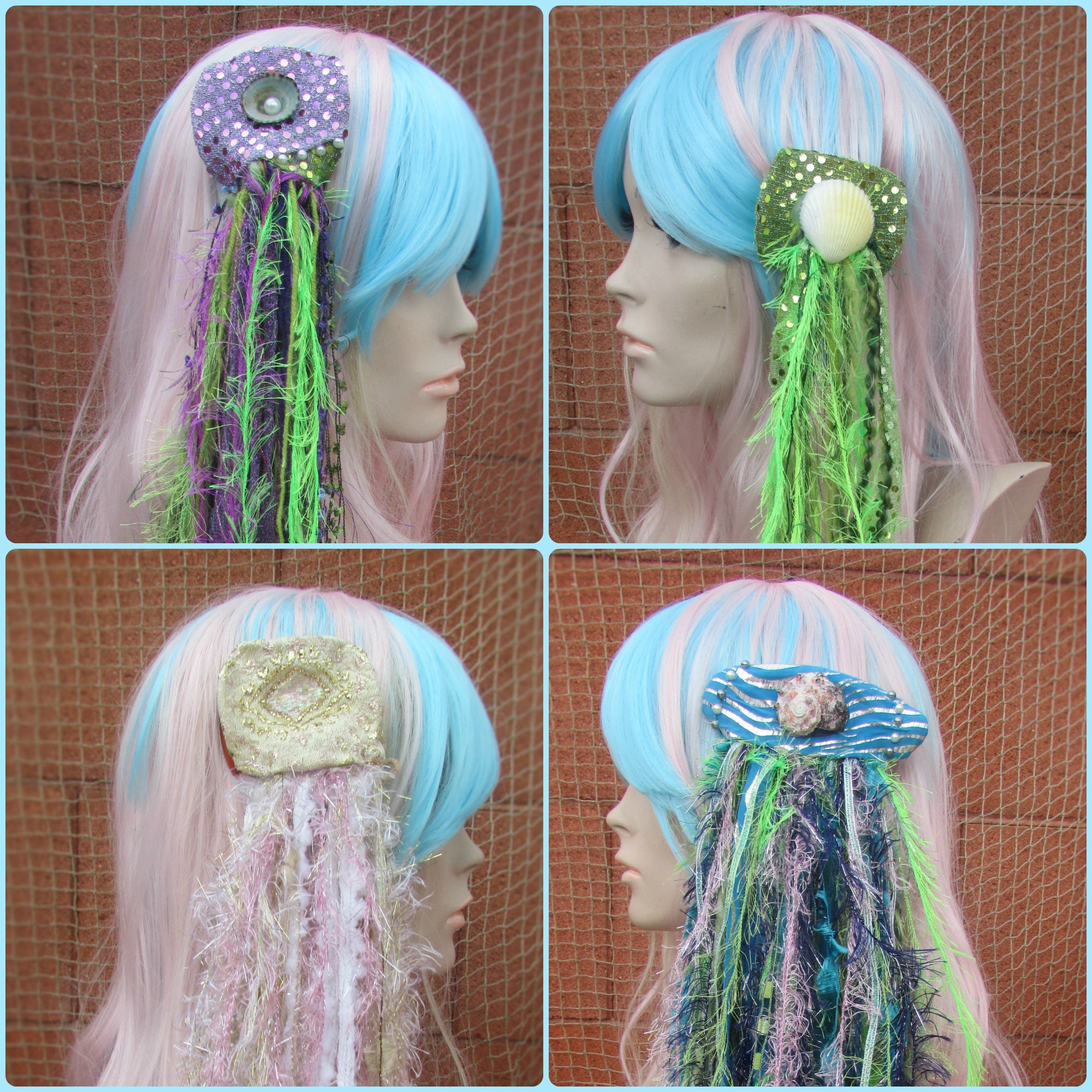 These mermaid clips are made of a variety of soft yarn, sea shells, fabric, and pearls. They all easily clipped into your hair creating instant mermaid hair. They can be worn in a variety of ways. Perfect costume accessory for mermaids of all ages!