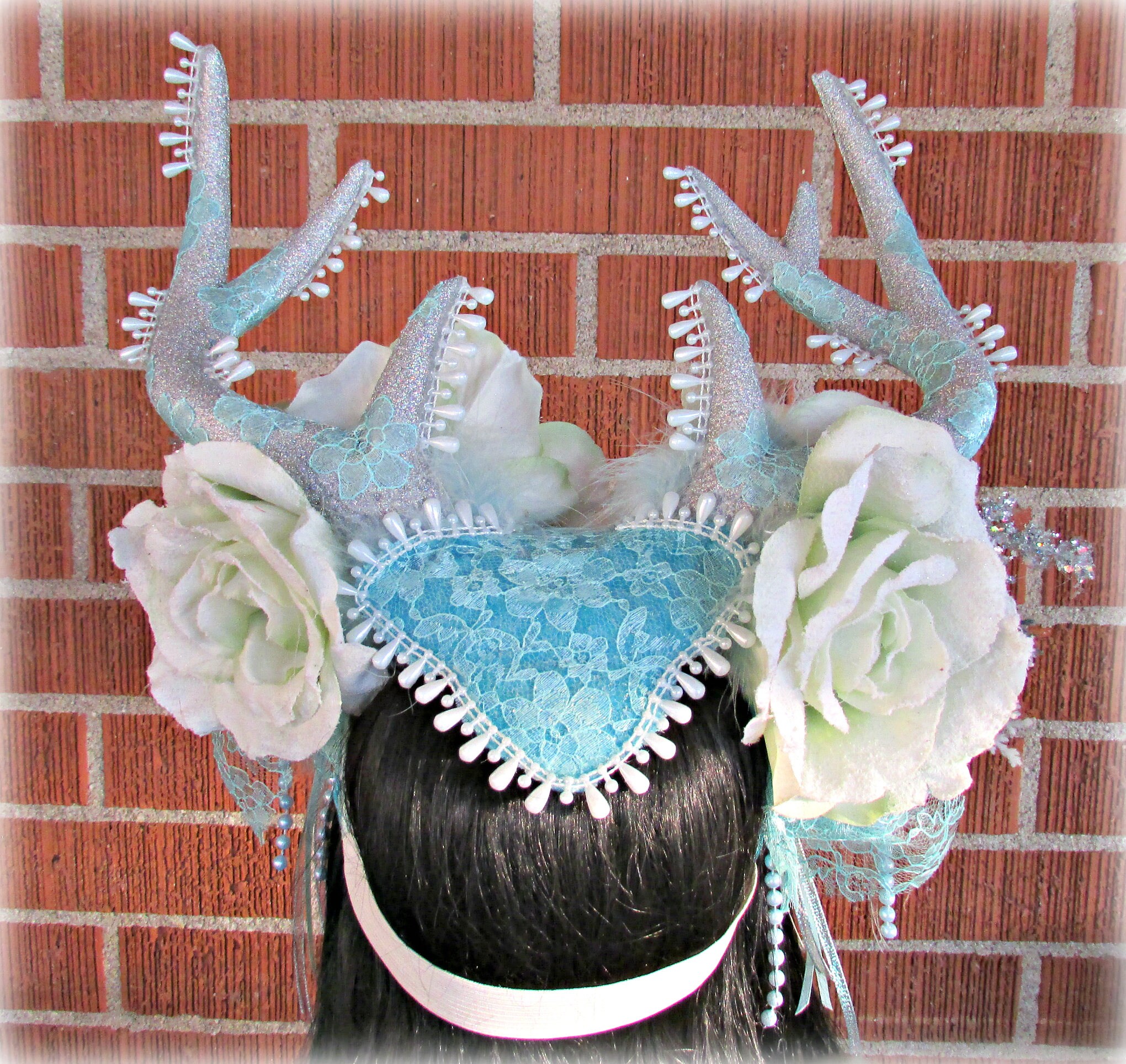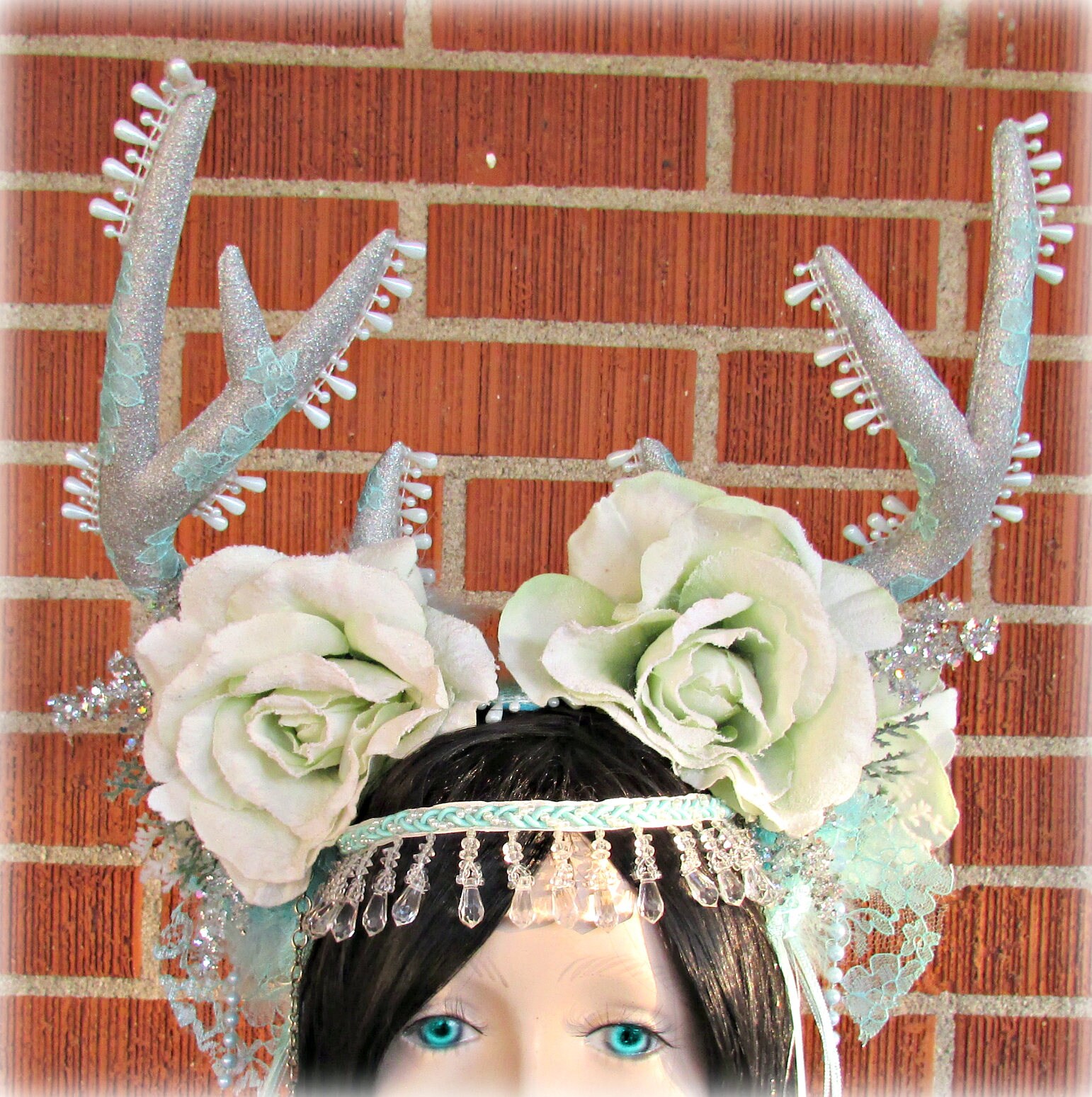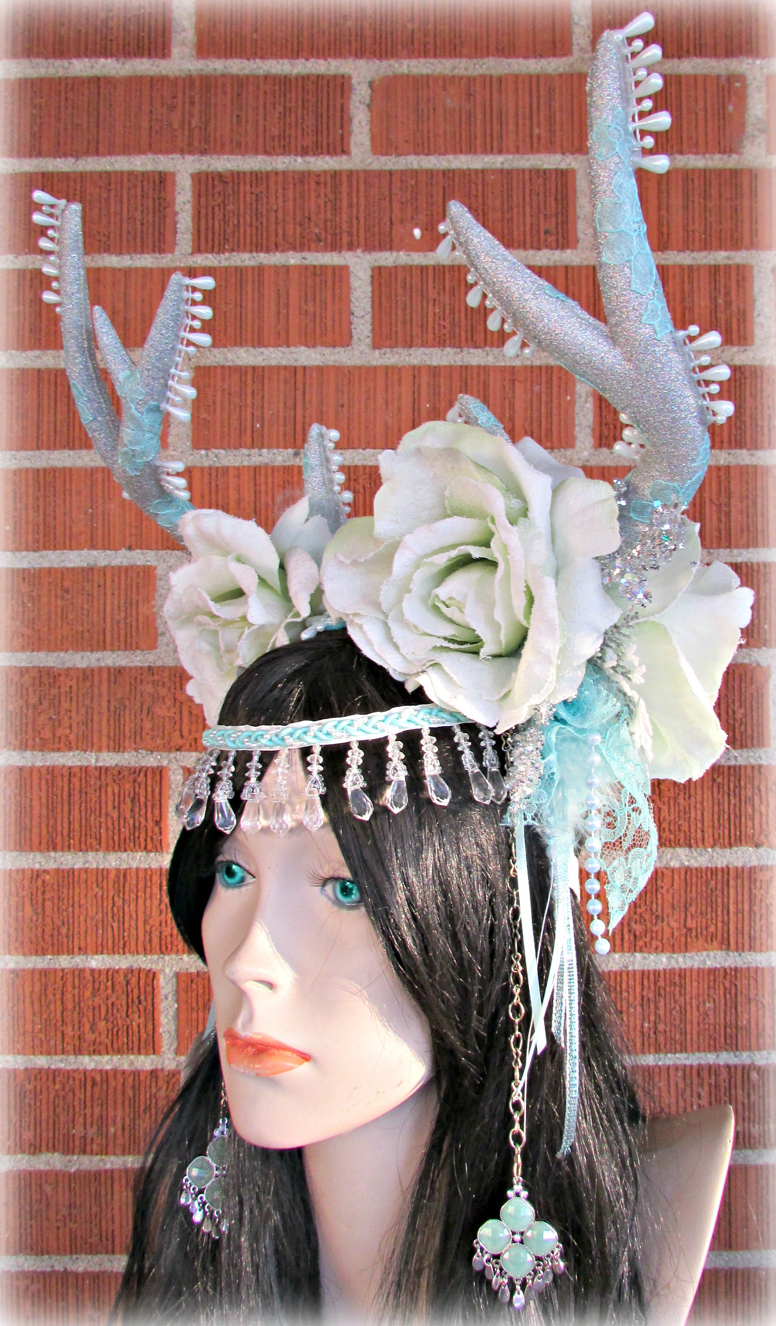 This headdress is made up of sparkly silver foam deer horns, light green frosted fabric roses, winter garland, plastic pearl beads, boa feathers, ribbon, and light aqua lace courtesy of of Amore Fabric and Lace. It is all attached to a headband and has a braided band with plastic crystal beads that dangle along the forehead. I added the lace and pearl beads to both the sides and along the horns. I also added silver chains with pendants at the ends to each side. There is an elastic band in the back that runs along your lower hairline to provide extra security.