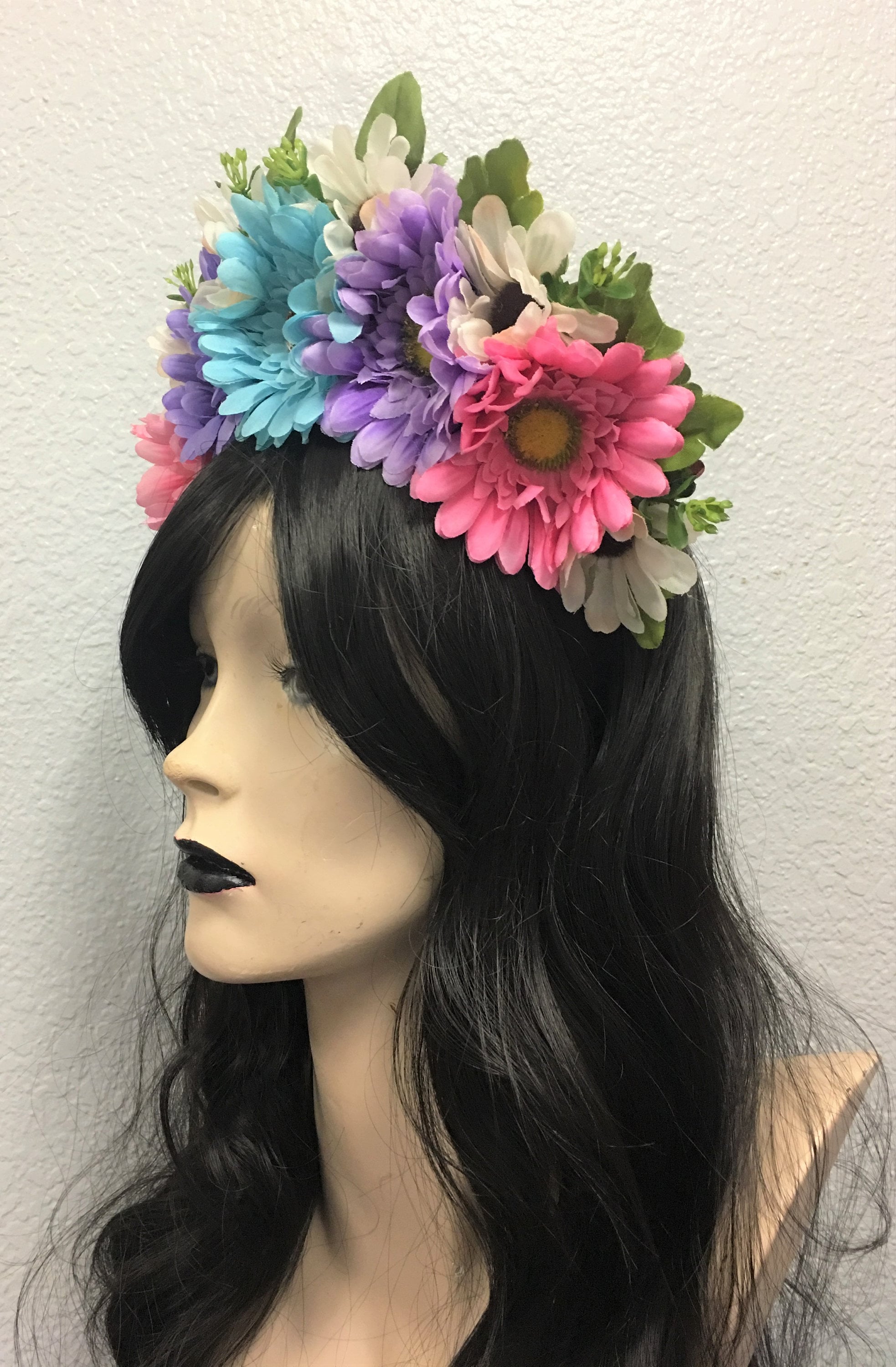 This super adorable floral crown is made up of a variety of spring colored fabric daisies, foliage, and fabric leaves all attached to a headband. This headdress is light weight and comfortable to wear. Perfect for all ages, weddings, holidays and festivals.
