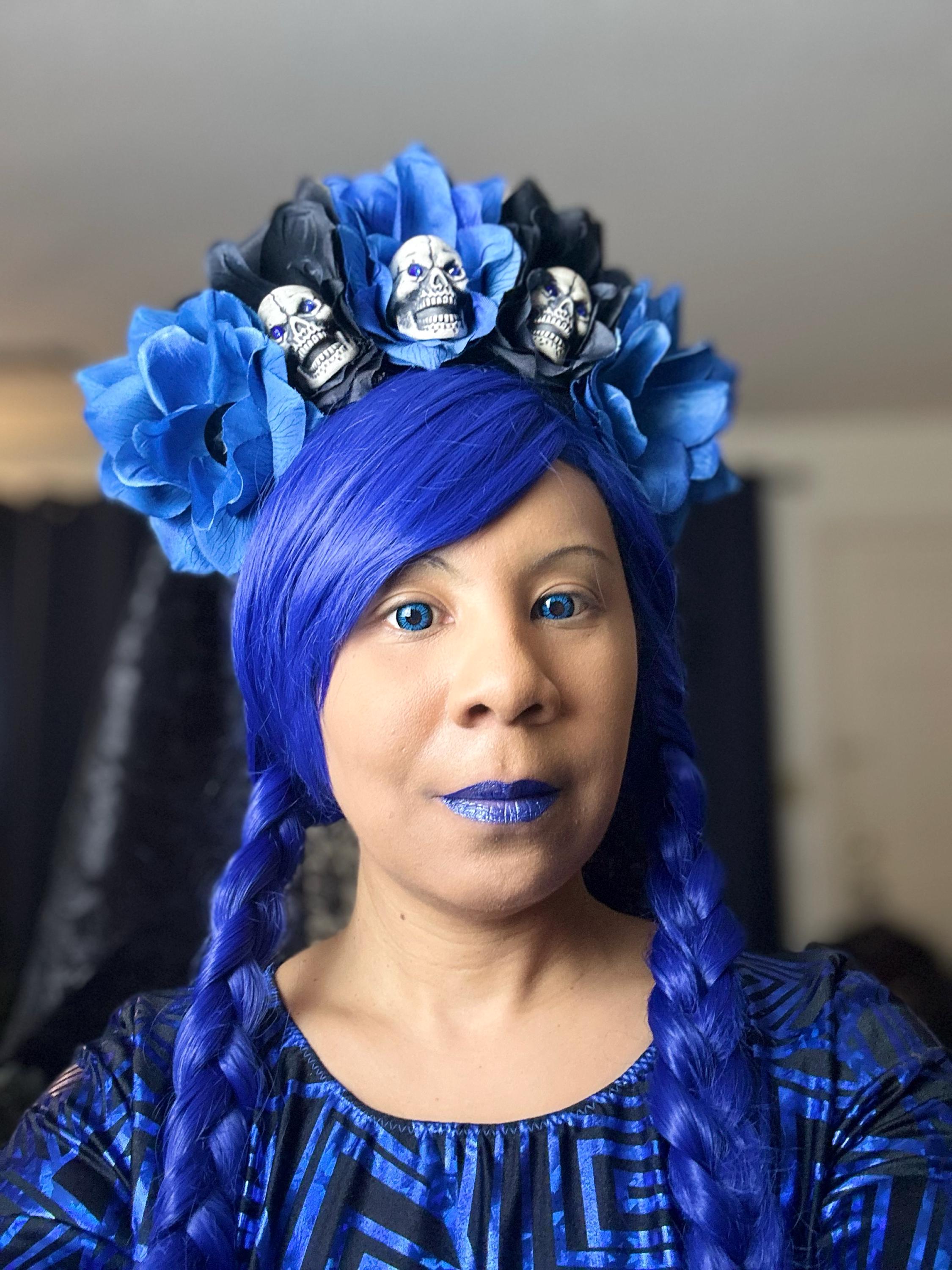 Blue and black Día de Muertos inspired rose crown.